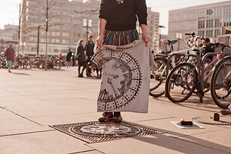 Raubdruckerin 是一個(gè)來自德國(guó)柏林的藝術(shù)團(tuán)體,他們稱“Raubdruckerin”就是海盜打印機(jī)的意思。他們這個(gè)藝術(shù)團(tuán)體會(huì)到世界上的各個(gè)城市找到各種各樣的井蓋、溝蓋板、警示牌或者通風(fēng)口,發(fā)現(xiàn)其中的美,就像海盜一樣,去各個(gè)城市掠奪屬于那個(gè)城市的符號(hào),并將這些符號(hào)印在T恤、手提袋上,以這樣的方式留下這座城市美好的印記。